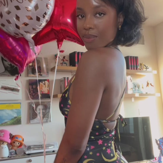 Radiate cosmic confidence in the Pretty Soldier Mini Dress (Black Edition) — where sleek sophistication meets playful celestial energy. Set against a deep black base, this mini dress brings the night sky to life with colorful moon and star motifs, charming ribbons, and dreamy “pretty soldier” graphics.